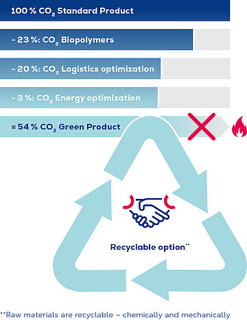 Das Potenzial, den CO2-Fußabdruck in der Lieferkette erheblich zu verringern - und gleichzeitig die guten Eigenschaften und die Qualität des Produkts beizubehalten. Insbesondere bei bestimmten Produktkategorien können die CO2-Emissionen erheblich reduziert werden, wenn ISCC PLUS-zertifizierte Materialien verwendet werden.